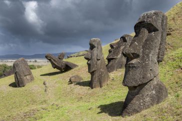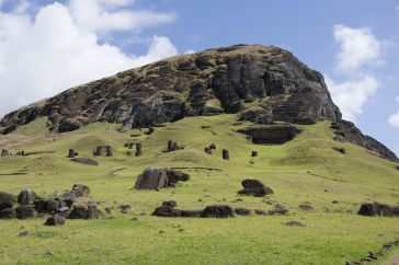 Sur les flancs du volcan gisent 397 moaï, dont un groupe d'environ 70 sentinelles semblant veiller sur l'île. On aperçoit aussi le plus grand des moaï jamais sculpté qui atteint près de 21 m de longueur.