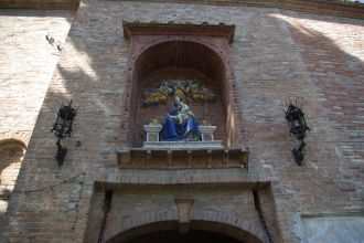 L'entrée se fait par une tour ornée de terre cuite et qui possède son pont levis à chaîne. Une petite pente et nous arrivons devant les absides et le campanile.